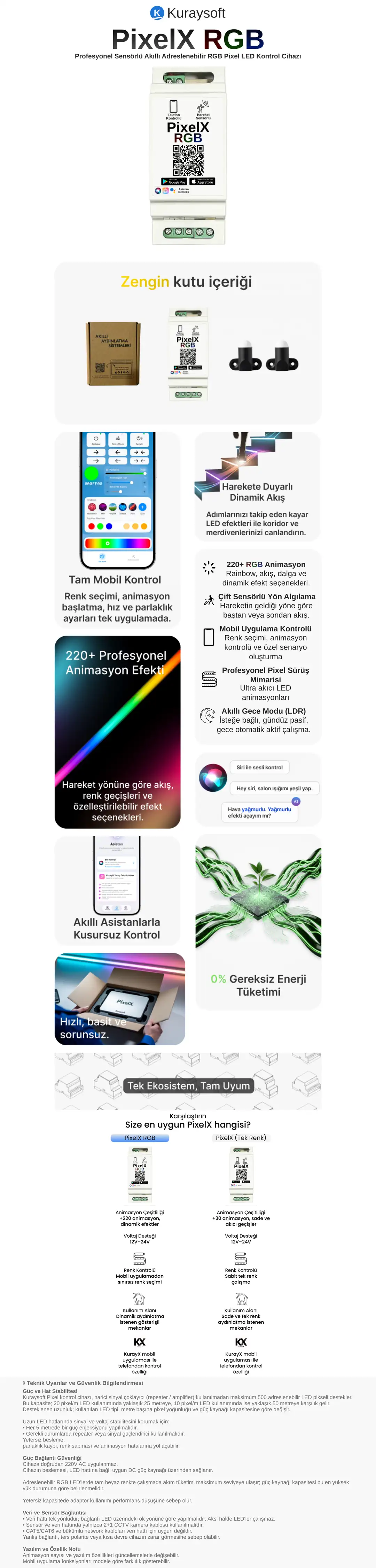 Kuraysoft, akıllı aydınlatma ve elektronik ürünler alanında uzun yıllara dayanan deneyime sahip bir ekip tarafından kurulmuştur. Kendi geliştirdiğimiz akıllı cihazların yanı sıra şerit LED’ler, animasyon kontrol üniteleri ve özenle seçilmiş ürünlerle müşterilerimizin ihtiyaçlarını karşılıyoruz. Yenilikçi çözümler, kaliteli ürünler ve hızlı hizmet anlayışımızla, ev ve iş yerlerinizi daha akıllı ve konforlu hâle getirmeyi hedefliyoruz.
